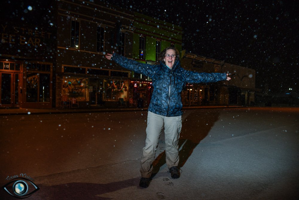 Standing in the middle of the road, hands outstretched, eyes towards the sky and grinning from ear to ear, I felt a sense of bliss as Joe snapped a shot. In the predawn darkness, the yellow and red lights from the buildings reflected on the snow. Through the lens, the puffy snowflakes gleamed in the light.  This was going to be a great day!