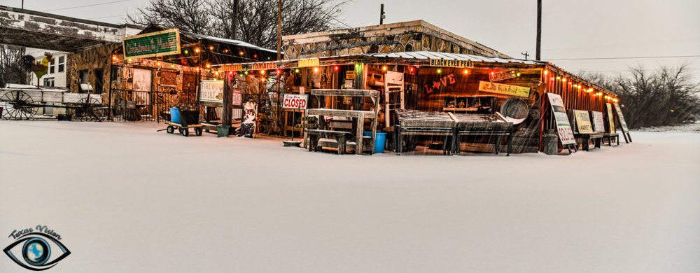 After capturing the fruit stand, we decided to head back up to the town square. A news crew from WFAA, channel 8 news, had been there since the early morning hours, as well. They, too, believed this to be the perfect backdrop for the days’ winter wonderland. We parked our car and had to search for winter gloves and hats on the floor board before exiting the vehicle. This treat had taken us by surprise. The historic courthouse and down home feel of the storefronts were coming alive with the light of day. Grey snow of the night turned to glistening white with the warm glow of the sun. The courthouse, built in 1895, has a dusting of snow on the roof. On the grounds around the building, there was not a single footstep to break the perfect carpet of white. This scene, just as the fruit stand, would have looked surprisingly the same 50 years ago. Walking around the square, the next place that caught my eye was a restaurant on the corner of Main and State Street, Sweetie Pie’s Ribeyes.  This place has stayed true to the old time, western feel. Wooden slat walls and log hewn benches surround the red lights from the neon entrance sign; the only clue that we are in the 21st century and not early 20th. The red light, however, was one of the keys that drew us to this corner.