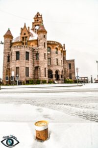 We traversed the town square for about an hour. It was about 8:30 am. We stopped to say hello to the fellow photographer and journalist from the news crew. Trinity Street Coffee Bar beckoned to us. Time to get warm on the inside and out. “Let’s get a coffee!” Joe said emphatically.The bar is known for hand crafted coffee in the morning and adult beverages in the evening, a cool place. I ordered a coffee with vanilla and Joe decided to add a touch of caramel to his concoction. The barista took time to design the perfect heart with swirls in the foam of my drink and placed the steaming beverage on the bar. That is too pretty to drink, I thought. ” Hey, let’s take a pic of the coffee in the snow!” I exclaimed to Joe. Before touching the cup to my lips, Out the door we went. Joe looked around and placed the cup in the morning snow. After shooting a couple of angles, our favorite was the coffee in the snow with the courthouse softly blurred in the background, the perfect shot….Well, if would have been steaming, that would have made it REALLY perfect. Joe always says that the same thing holds true on any shoot. ” There is what you want, what there is and what you get.” We were both happy with what we got on this one.