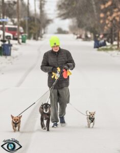 OK, time for a change of scenery. “Let’s see what else we can find” Joe said as we headed for the SUV. Today is a day we are glad to be driving a 4-wheel drive! Driving around town a quaint little, white church with a red door drew our gaze. Joe made the block and we parked on the opposite side of the street. There was a yellow glow of light streaming from the arched windows of the entrance. It reminded me of twilight. Later we posted the image and Roy Eaton, local celebrity journalist and owner if the Wise County Messenger commented, “reminds me of Vermont”, great description. The snow covered ground, small white church, surrounded by trees. I worked through shooting HDR images of the church while Joe focused on the play of the ice crystals on the door handle of our vehicle and snow covered wheels, leading to the road beyond. That is when the moment you can’t plan for happened. Joe noticed a woman bundled up in coat, gloves and a bright yellow tabogan walking her dogs across the street about a block away. By the time he saw it, she had already crossed the street and the image he wanted was gone. “Wait!! Hey there!” I yelled to the unsuspecting subject, “Can we take your picture?” She turned around with a smile on her face and started walking towards us. Most people, if you ask nicely,  really do want to be involved in making an image. In perfect irony, Joe captured an image with all 3 dogs looking right at him, while there human counterpart looks down to adjust her gloves.