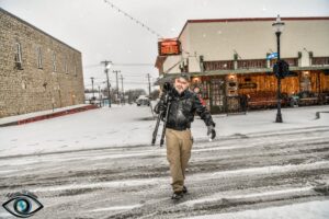 We traversed the town square for about an hour. It was about 8:30 am. We stopped to say hello to the fellow photographer and journalist from the news crew. Trinity Street Coffee Bar beckoned to us. Time to get warm on the inside and out. “Let’s get a coffee!” Joe said emphatically.The bar is known for hand crafted coffee in the morning and adult beverages in the evening, a cool place. I ordered a coffee with vanilla and Joe decided to add a touch of caramel to his concoction. The barista took time to design the perfect heart with swirls in the foam of my drink and placed the steaming beverage on the bar. That is too pretty to drink, I thought. ” Hey, let’s take a pic of the coffee in the snow!” I exclaimed to Joe. Before touching the cup to my lips, Out the door we went. Joe looked around and placed the cup in the morning snow. After shooting a couple of angles, our favorite was the coffee in the snow with the courthouse softly blurred in the background, the perfect shot….Well, if would have been steaming, that would have made it REALLY perfect. Joe always says that the same thing holds true on any shoot. ” There is what you want, what there is and what you get.” We were both happy with what we got on this one.